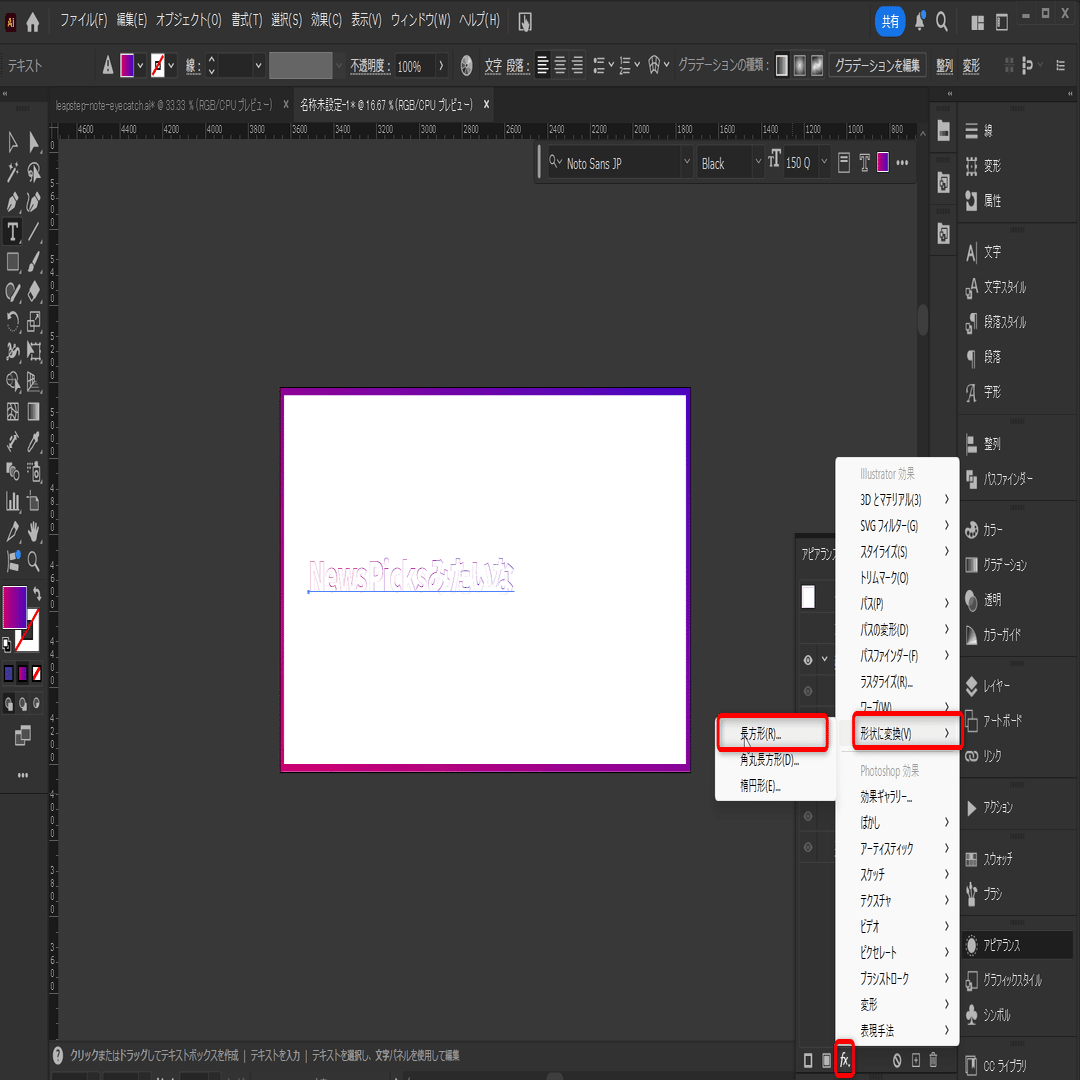 2番目の塗り(グラデーション)に対し、fx → 形状に変換 → 長方形の順に選択していきます。