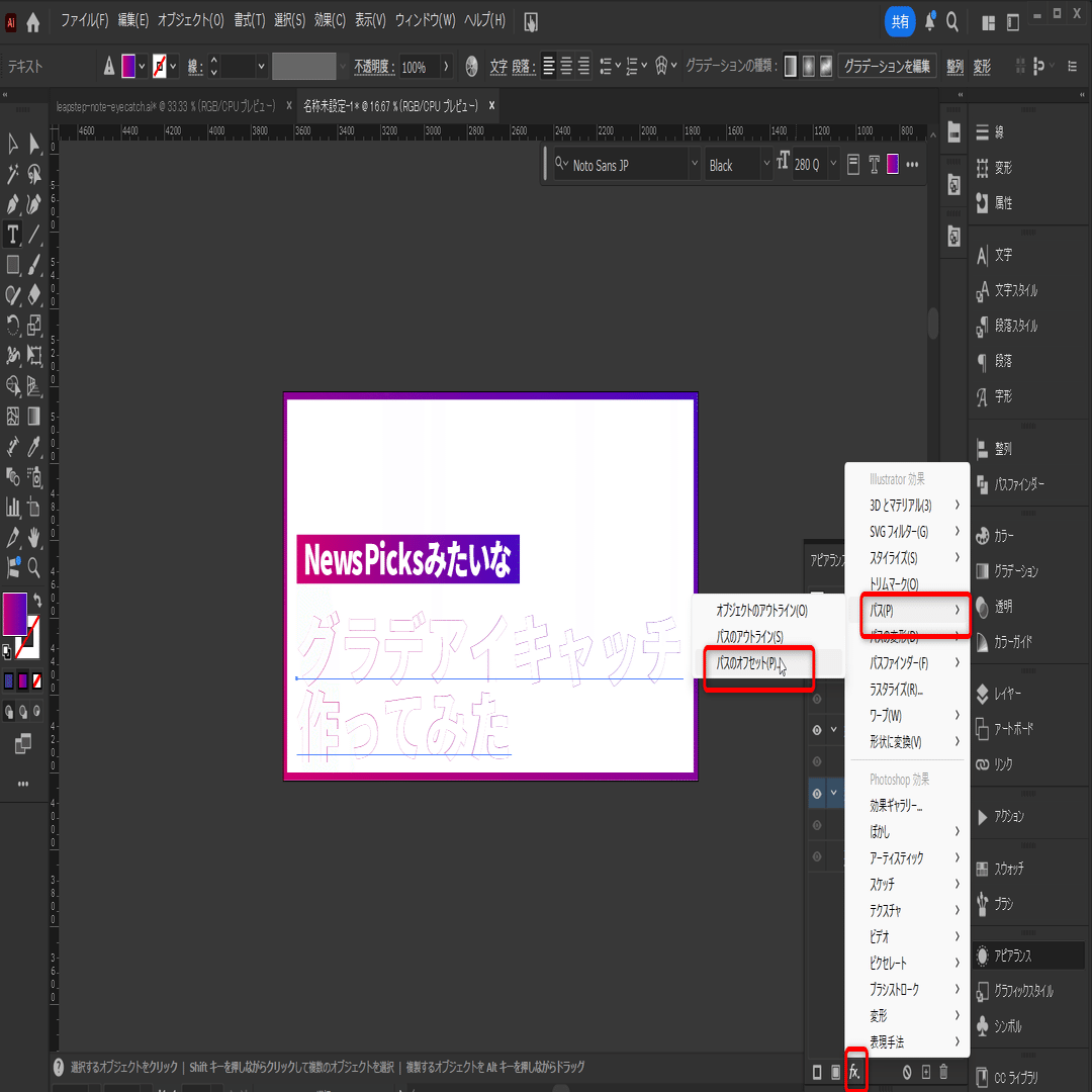 ※オブジェクトのアウトラインは、fx → パス → オブジェクトのアウトラインで入れることができます。